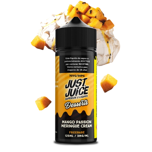 Sumérgete en la suavidad tropical con JUST JUICE MANGO PASSION MERINGUE CREAM, un e-liquid de 120ml que combina mango jugoso con merengue cremoso. Esta mezcla exótica es perfecta para quienes buscan un vapeo dulce y cremoso.