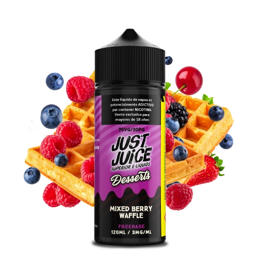Experimenta la fusión de sabores con JUST JUICE MIXED BERRY WAFFLE, un e-liquid de 120ml que combina una variedad de bayas frescas con el sabor de waffles recién horneados. Esta mezcla es ideal para quienes buscan un vapeo dulce y reconfortante.