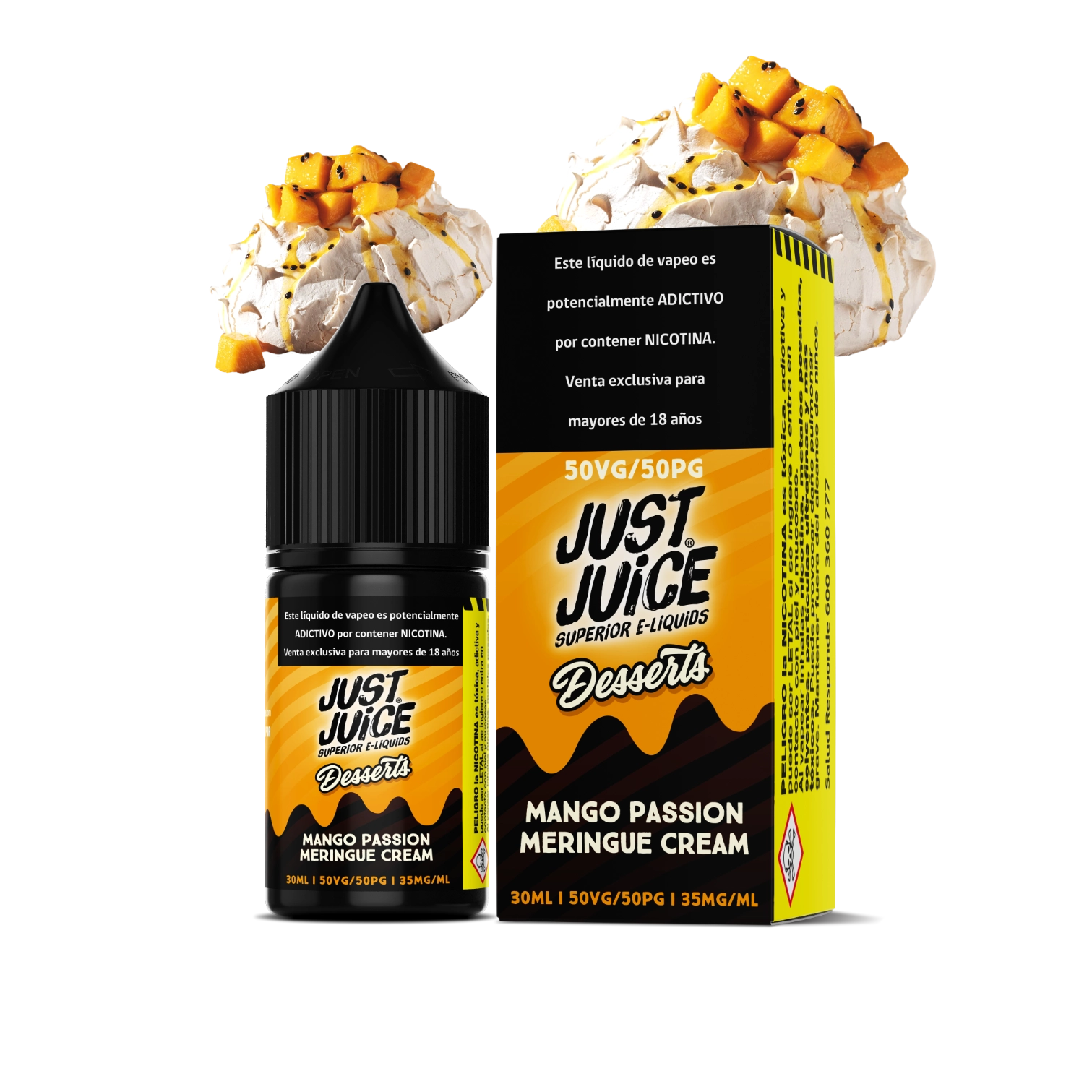 Haz de JUST JUICE SALT NIC MANGO PASSION MERINGUE CREAM tu elección diaria y disfruta de la tropicalidad en cada inhalación.