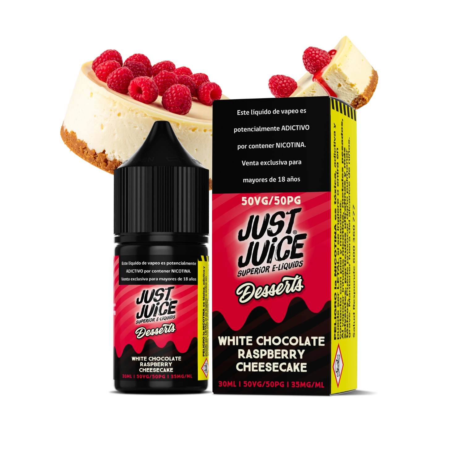 Haz de JUST JUICE SALT NIC WHITE CHOCOLATE RASPBERRY CHEESECAKE tu elección diaria y disfruta de la dulzura en cada calada.